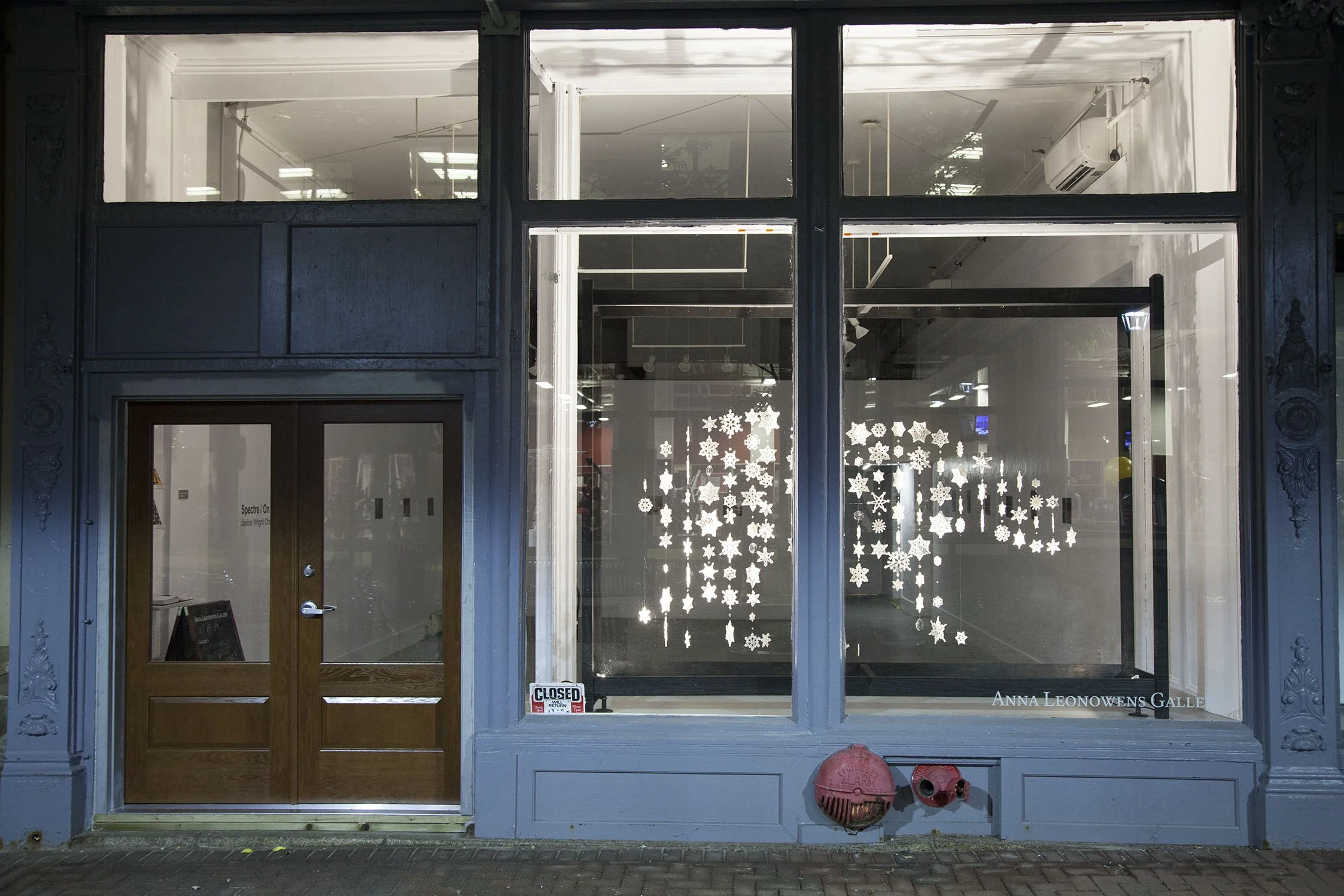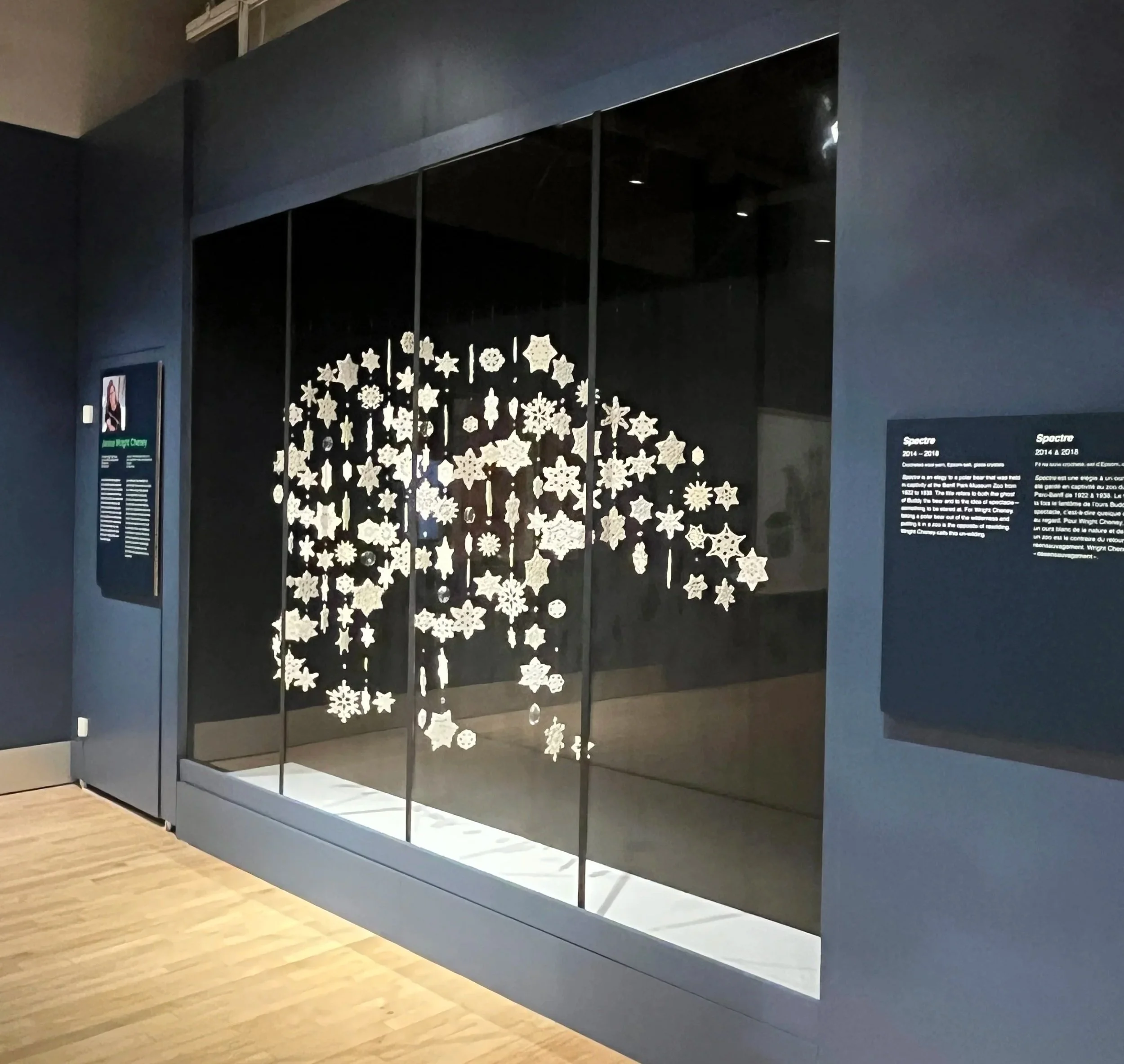 Spectre is an elegy to a polar bear that was held in captivity at the Banff Park Museum Zoo from 1922 until 1938. Crocheted snowflakes and crystals, suspended in a darkened room, create the bear’s silhouette. The title, Spectre, means both ghost and spectacle.